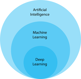 1. ábra: A gépi tanulás a mesterséges intelligencia egy részterülete, amelynek szintén vannak további speciális részhalmazai, mint például a mélytanulás [2].