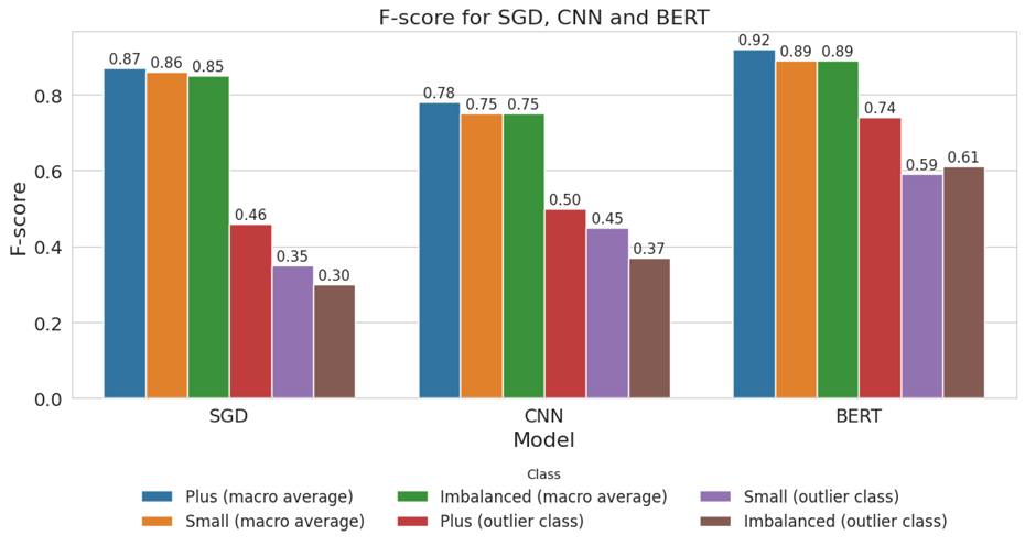 A BERT minden szempontból felülmúlta a másik két modellt, javított az átlagos teljesítményen és az outliereket is hatékonyabban ismerte fel. A másik két modellel ellentétben a BERT hatékonysága nem csökkent kiegyensúlyozatlan adatok mellett, sőt némelyik osztályban (például az outlier osztályban is) javulás volt megfigyelhető a Small adatbázishoz képest. Ez valószínűleg annak köszönhető, hogy az Imbalanced adatbázis nagyobb mennyiségű tanítóadattal rendelkezik, mint a Small, még ha azok kiegyensúlyozatlanok is.