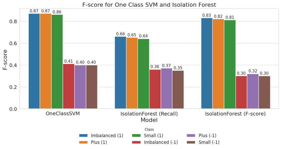 A felügyelet nélküli tanítású modellek közül a One Class SVM teljesít a legjobban, recall értékei meghaladják az átlagos F-score értékre optimalizált Isolation Forest modell értékeit. Ez a módszer különösen hasznosnak bizonyul azokban az esetekben, amikor kevés adat áll rendelkezésre, és az osztályok közötti egyensúly nem biztosított. A One Class SVM esetében látható a legkisebb eltérés a recall értékek között, ez is a modell megbízhatóságát mutatja a különböző adatbázisok esetében.