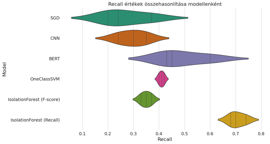 Az Isolation Forest modell F-score verziójának recall értékei közepes szinten helyezkednek el, míg az outlier osztályra fókuszáló verzió érte el az összes modell közül a legmagasabb recall értéket. Ez a modell még a BERT-et is megelőzte recall terén. A magas recall érték elérése azonban a többi metrikán erősen meglátszik, így a legtöbb gyakorlati esetben még mindig a BERT modell felhasználása lenne optimális.