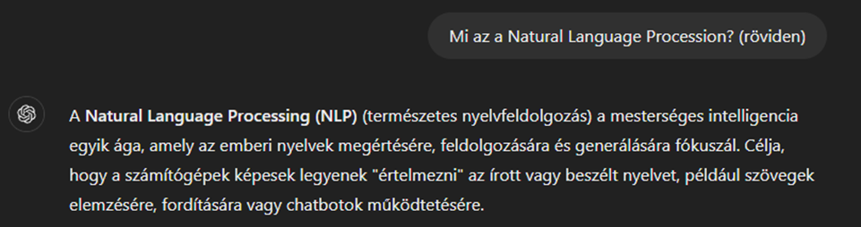 A Natural Language Processing, azaz NLP, a természetes nyelv gépi feldolgozásával, értelmezésével és generálásával foglalkozik. Napjainkban a Natural Language Processing a mesterséges intelligencia egyik legfelkapottabb területe, köszönhetően a széles körben elterjedt chatbotoknak és AI asszisztenseknek is. Ezek az eszközök képesek teljes, koherens szövegeket alkotni, valamint képesek feldolgozni a felhasználó természetes nyelvű kéréseit [7]. Ezek a funkciók mind az NLP felhasználásával valósulhattak meg.