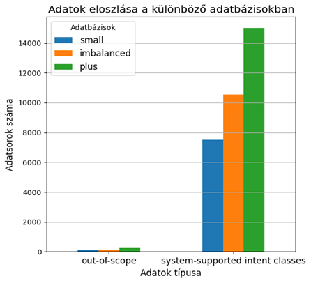 A különböző gépi tanulási kísérletek során a clinc_oos adatbázis verzióit használtam [13]. Ez az adatbázis 150 szándékot tartalmaz, 10 különböző témakörben. A clinc_oos egy olyan adathalmaz, amelyben megtalálhatóak kérések, amelyek kívül esnek a rendszer által támogatott szándékokon. Ez új kihívást jelent, mivel a modellek nem feltételezhetik, hogy minden lekérdezés a rendszer által támogatott szándékosztályba tartozik.