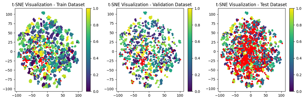 További szemléltetés céljából a legkisebb adatbázison klaszterezést hajtottam végre, hogy megfigyelhető legyen az OOS adatok elkülönülése a többitől (5. ábra). A szövegeket Sentence Transformers segítségével vektorokká alakítottam, ez a magas dimenziójú adat adta a klaszterezés alapját. A klaszterezést t-SNE segítségével végeztem el, ami egy statisztikai vizualizációs eszköz. A t-SNE, vagyis t-Distributed Stochastic Neighbor Embedding lényege, hogy a magas dimenziójú adatokat két- vagy háromdimenzióssá alakítja át, megőrizve az egymáshoz viszonyított hasonlóságukat [14].