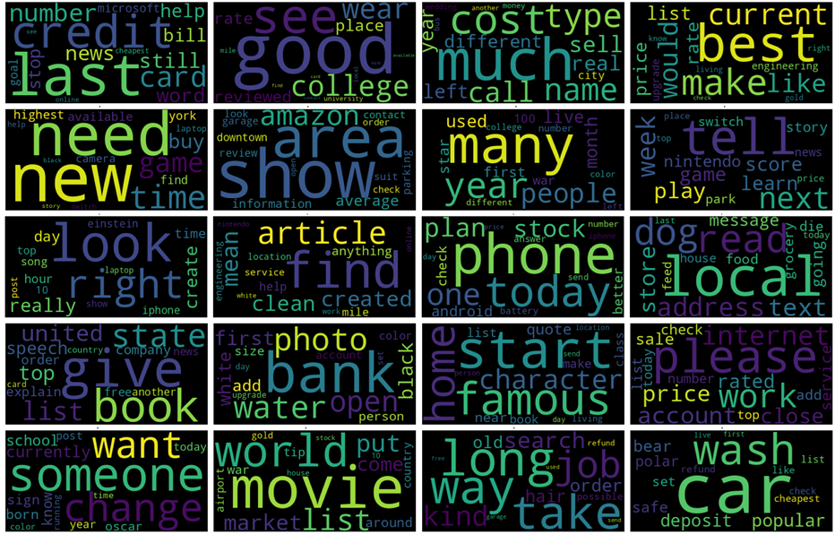 Klaszterezés alapján létrehoztam egy szófelhőt 20 témához, amin az egyes témák legjellemzőbb szavait jelenítettem meg (6. ábra). Az ábráról következtethető, hogy az OOS osztály elemeiben többek között előfordulnak történelmi kérdések, hírességek iránti érdeklődés, vásárláshoz való tanácskérés és háziállatok gondozásában való segítségkérés is. Amellett, hogy a nem megengedett kérések is hasonlóan sokszínűek, mint a rendszer által támogatott kérések, a két elkülönítendő kategória szókincse között nagy az átfedés. Az adatokat tanulmányozva azt is megfigyeltem, hogy a kérések hangvétele sem jellegzetes egyik csoportban sem. Az adatok diverzitása és a szókincs átfedése az osztályok között növeli a feladat komplexitását.