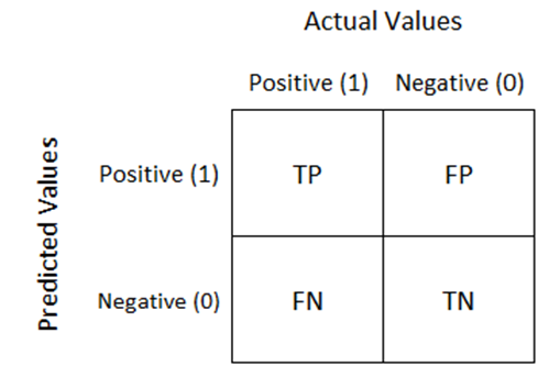 Egy adott osztályra vonatkozó predikciók pontosságát illetően négy esetet különböztetünk meg (7. ábra). Ebből két eset helyes predikcióra utal, ezek a True Positive (TP) és a True Negative (TN). True Positive esetén a modell helyesen adta meg az osztály címkéjét, True Negative esetén pedig helyesen másik osztályt adott meg predikcióként. A hibás esetek ezek ellentétei, False Positive-nak (FP) nevezzük amikor az adott osztálycímke tévesztésből eredően lett az adatsorhoz rendelve, False Negatívnak (FN) pedig, amikor a modell nem ismerte fel az osztály egyik elemét [16].